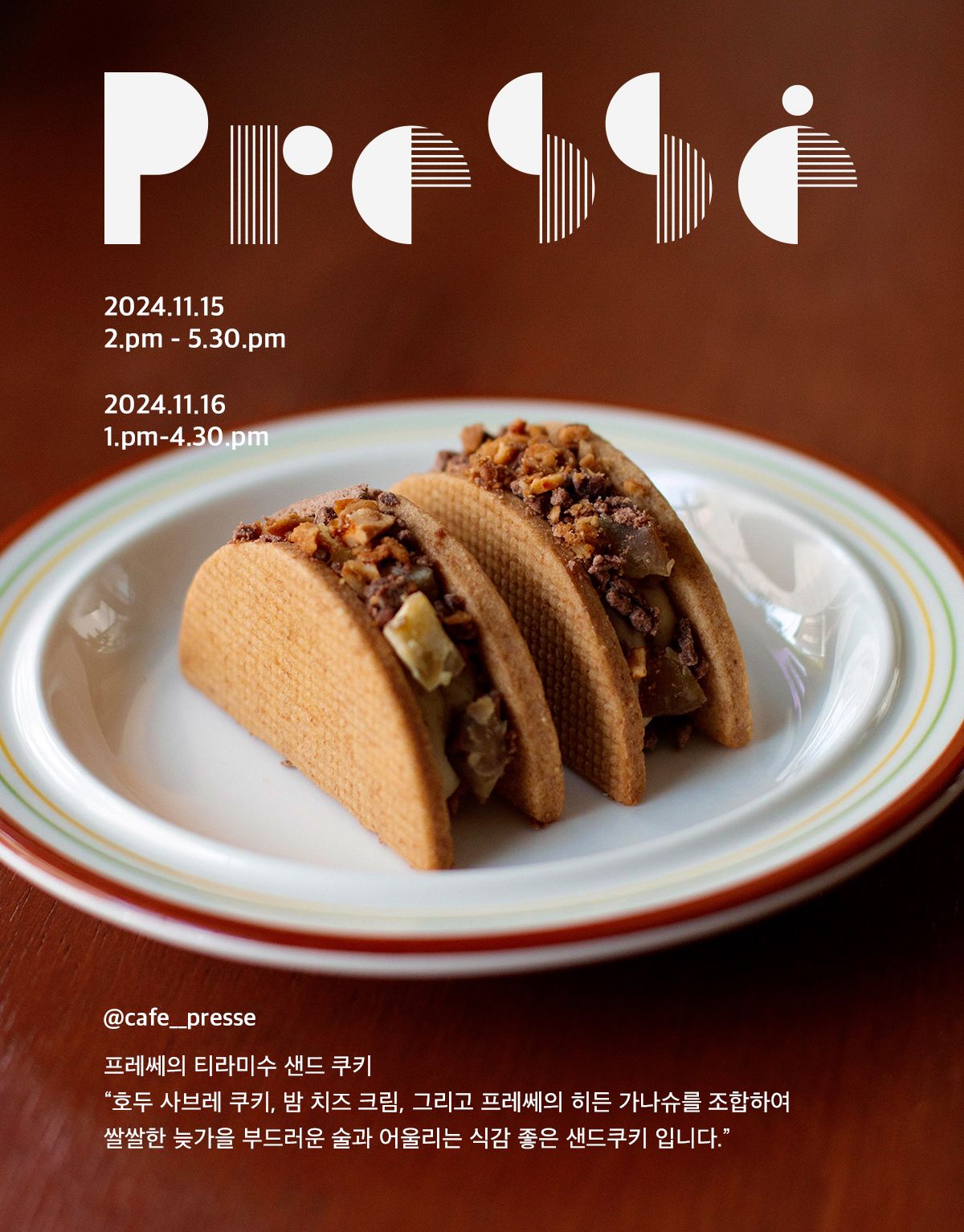 “호두 사브레 쿠키, 밤 치즈 크림, 그리고 프레쎄의 히든 가나슈를 조합하여 쌀쌀한 늦가을 부드러운 술과 어울리는 식감 좋은 샌드쿠키 입니다.”
